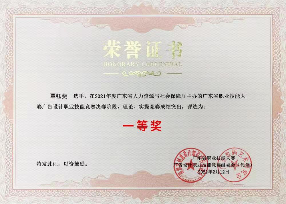 在近日广东省人力资源和社会保障厅公布文件中,公司太阳成集团tyc122ccvip覃钰斐老师在2021年广东省职业技能大赛广告设计职业技能竞赛中荣获一等奖,并被授予“广东省技术能手”荣誉称号。