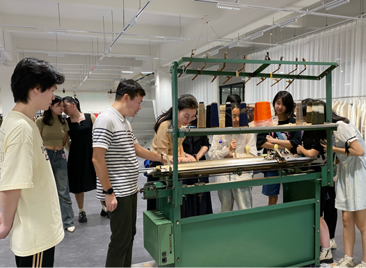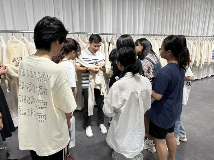 芙发服饰有限公司董事长刘春发带领大家参观展厅、服装设计部门、电脑横机车间,为员工讲解针织服装相关专业知识,并提出可通过共同规划、共同培养和共同创新,实现教育与产业的良性互动。