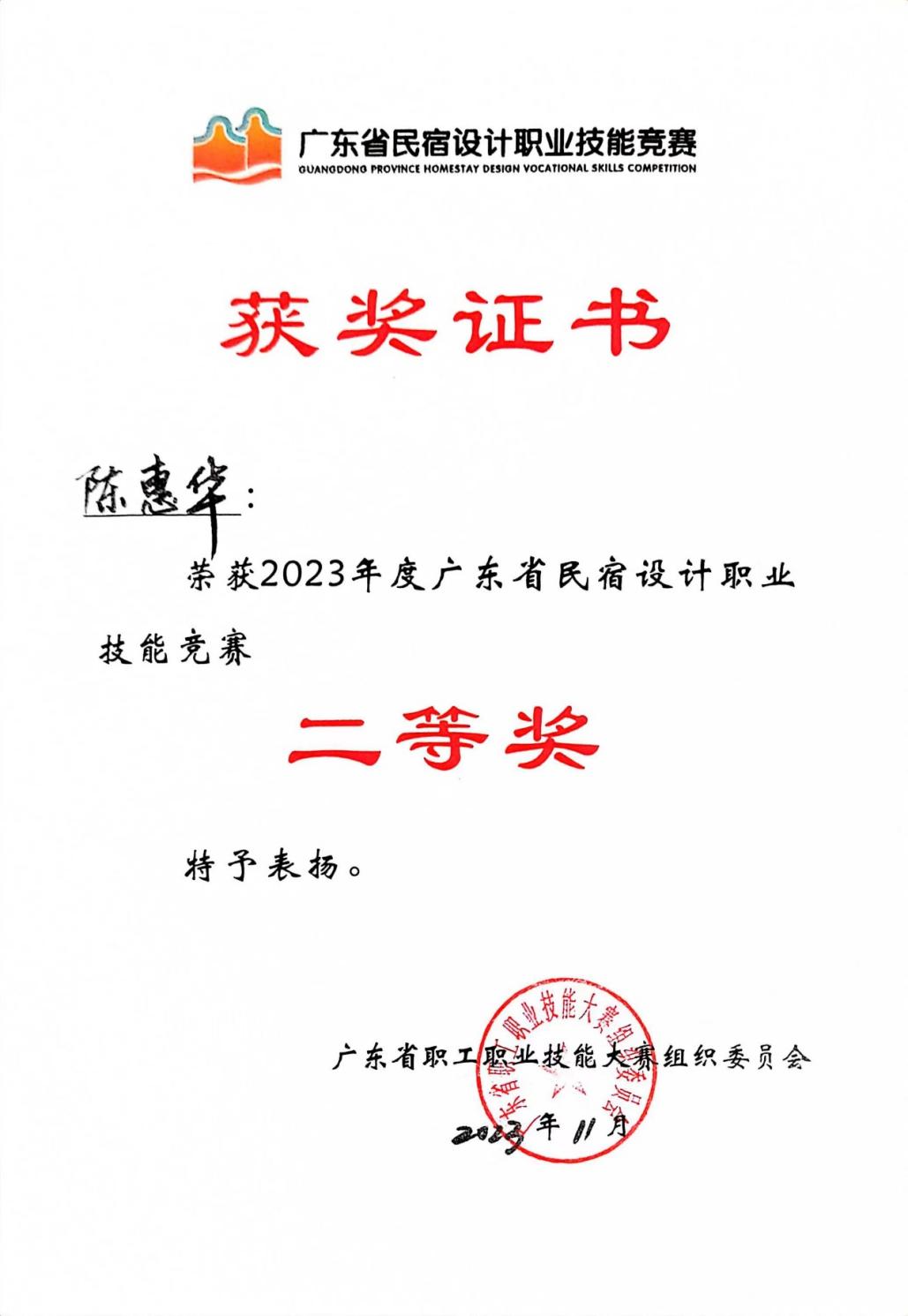11月26日,由广东省总工会、广东省人力资源和社会保障厅、广东省工业和信息化厅、广东省科学技术厅主办,广东省总工会职工技术协作中心、广东机电职业技术公司承办的2023年广东省民宿设计职业技能竞赛决赛经过两天激烈的比赛圆满结束。公司太阳成集团tyc122ccvip教师陈惠华荣获二等奖,并获得“广东省银牌民宿设计师”证书。