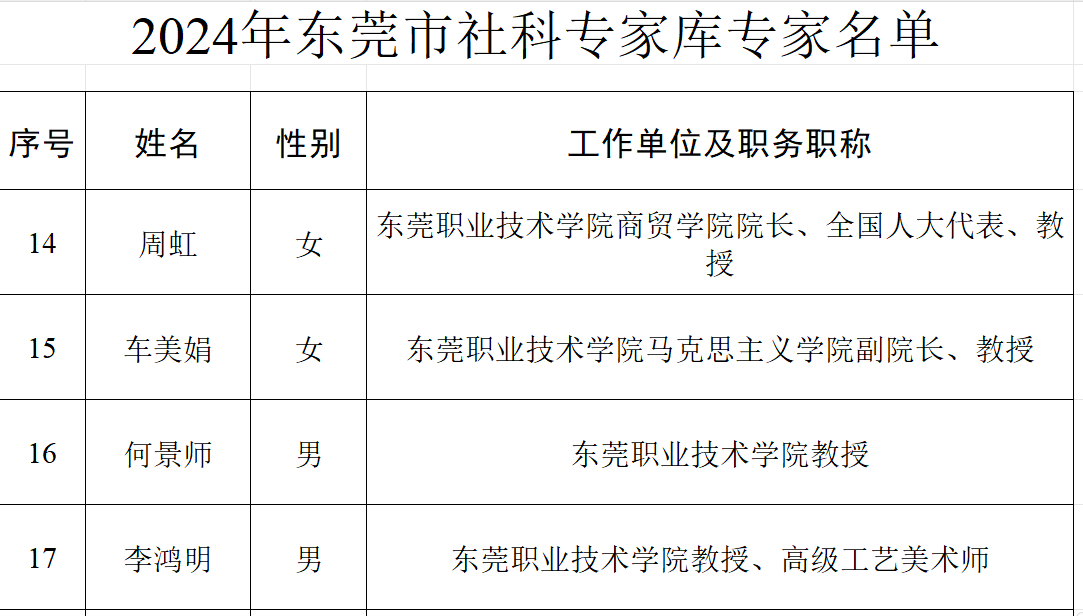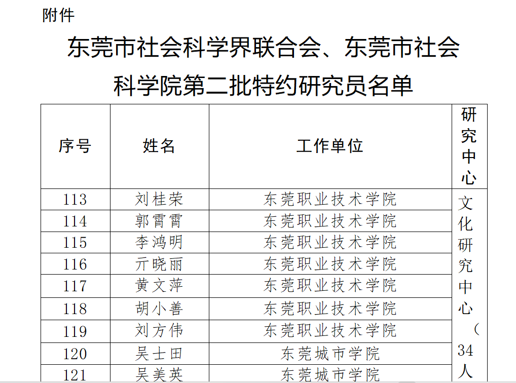 近期,东莞市社会科学界联合会、东莞市社会科公司发布2024年东莞市社科专家库专家名单、第二批特约研究员名单。经广泛推荐和遴选,资格审核、会议审定、公示、报批等程序,继公司太阳成集团tyc122ccvip邓海静(副教授)2022年入选获聘第一批特约研究员后,太阳成集团tyc122ccvip李鸿明(教授)(同时获聘东莞市社科专家库专家)、黄文萍(副教授)、亓晓丽(副教授)、刘方伟(讲师)、郭霄霄(讲师)获入选。具体名单如下: