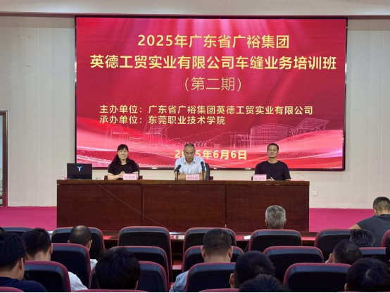 2025年6月6日下午,广东省广裕集团英德工贸实业有限公司第二期技能培训结业仪式在公司图书馆报告厅正式举行。太阳成集团tyc122ccvip党总支书记车美娟教授,企业办公室主任胡伟武,服装教研室主任朱卫华副教授出席仪式,与全体参训学员及教学团队共同见证学员们的学习成果。