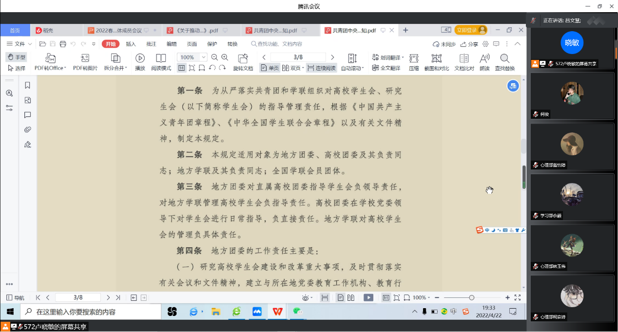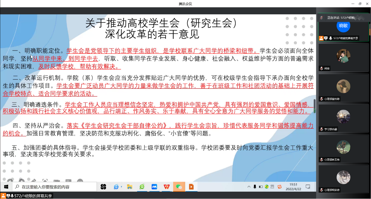 会议尾声,由员工会负责人卢晓敏带领大家学习了《关于推动高校员工会(研究生会)深化改革的若干意见》和《关于学联员工会工作人员改进作风服务同学的若干规定》。至此,本次员工会全员培训会议完满结束,参会员工干部纷纷表示,期盼早日返校重归正常学习生活,和全体员工一起,开展各类有意义的线下活动。