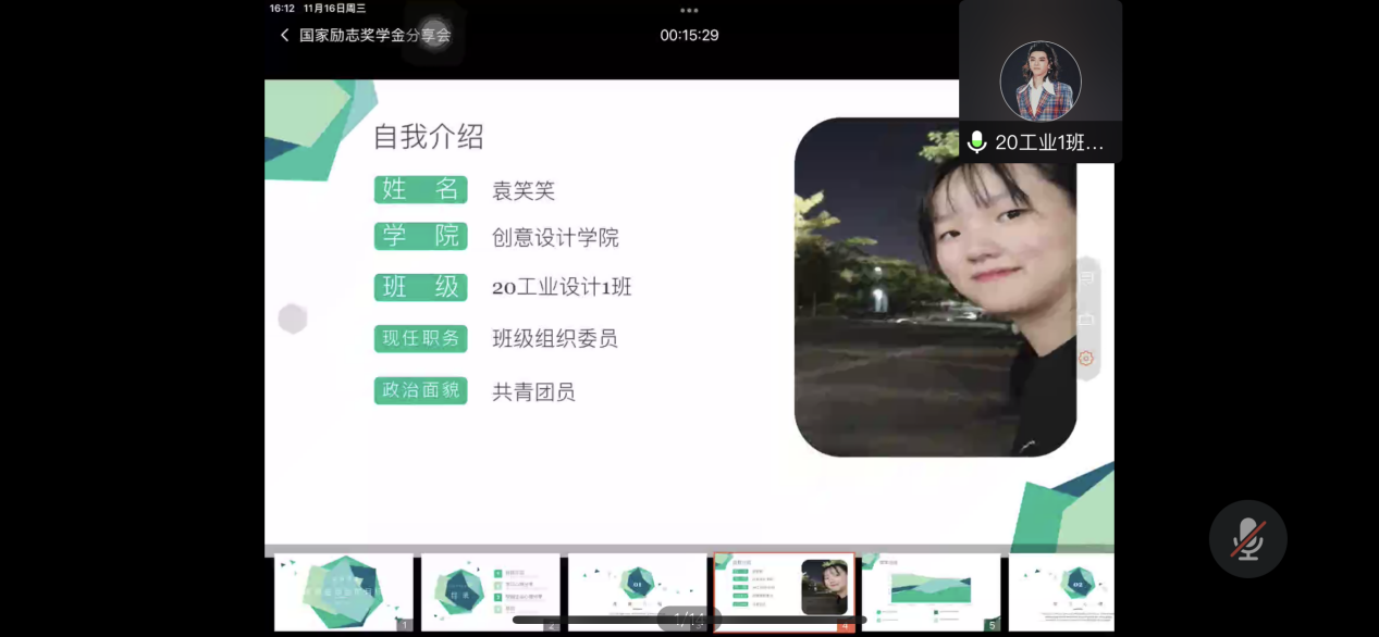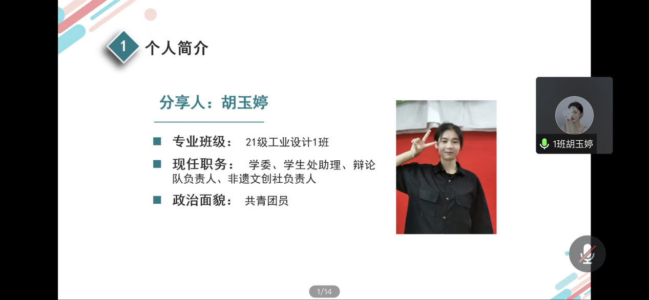 21工业设计1班的胡玉婷,主题:与时间赛跑。从她的分享中得知,永远不要满足于课堂上的知识,掌握更多的实操性技能,在互联网时代多掌握一个技能就意味着多一个可能性。