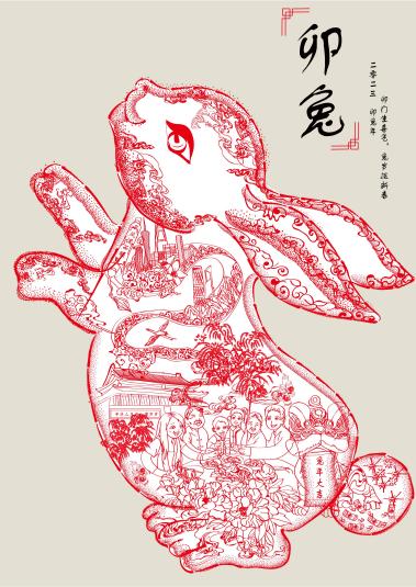 在这一次的兔生肖设计中,我的灵感来源于中国传统文化的剪纸效果,在传统的剪纸中色块会更强,我将色块改成了表达感更强的线条,主要的设计分为兔生肖轮廓,还有中国传统元素等。