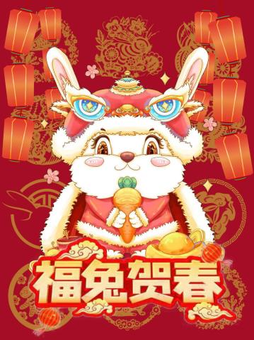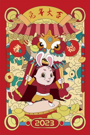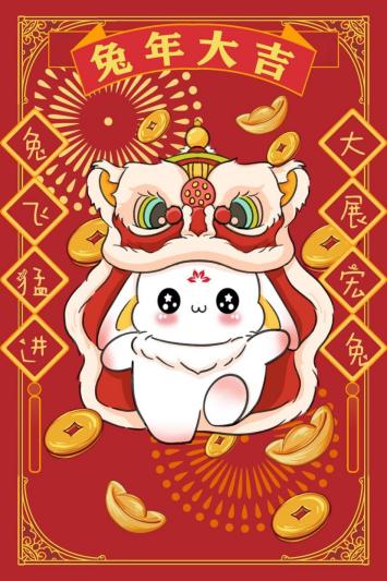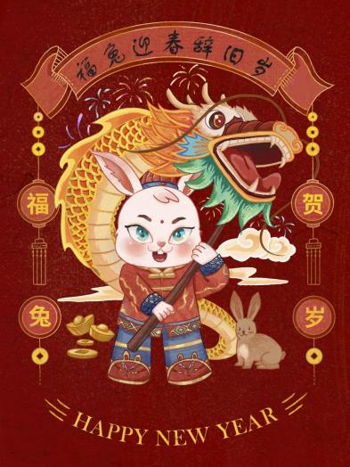 这是一张兔年的海报,整体色调为喜庆的红色。横幅写着“福兔迎春辞旧岁”,贴合海报主题。主体物是一只身着中国风服饰的兔子正在舞龙,这是父母祈求孩子健康长大的求吉祥举动。画面多有金币,元宝装饰寓意财源滚滚。烟花烘托出过年的氛围。
