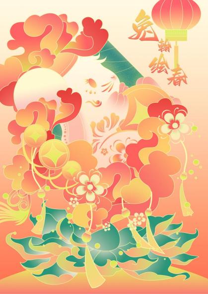 我们的海报主题主要体现福兔贺春,又体现了传统文化元素的融合。海报以兔子为主,传统文化为辅,色彩多样,画面丰富。希望大家新的一年,家和万事兴、幸福安康、心想事成,财源滚滚。兔子手上拿的灯笼照亮的新的一年前进的道路。