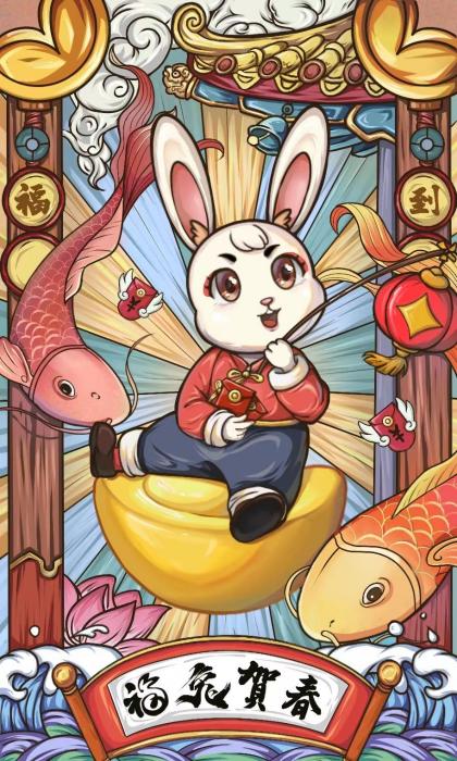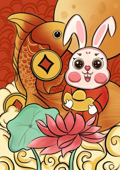 鱼有富余,多余的寓意;鱼有用作人名意指富裕、幸福、前途美好之义。荷花有着幸福美满的寓意,代表着家庭幸福和阖家团圆的美好愿望,铜钱元宝象征财富,象征对兔年的美好期望。