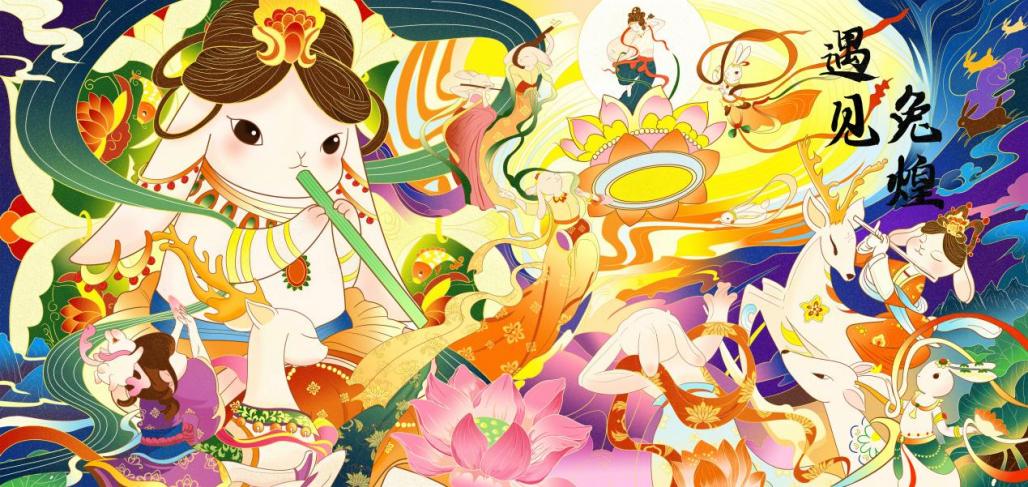 以敦煌经典飞天乐伎、中国传统乐器以及敦煌经典色彩为蓝本,结合兔年新春祝福绘制出的萌动可爱的兔子形象,手持各色乐器轻盈飞舞在空中,呈现出别开生面的盛世敦煌文化,带来美好的春节祝福。