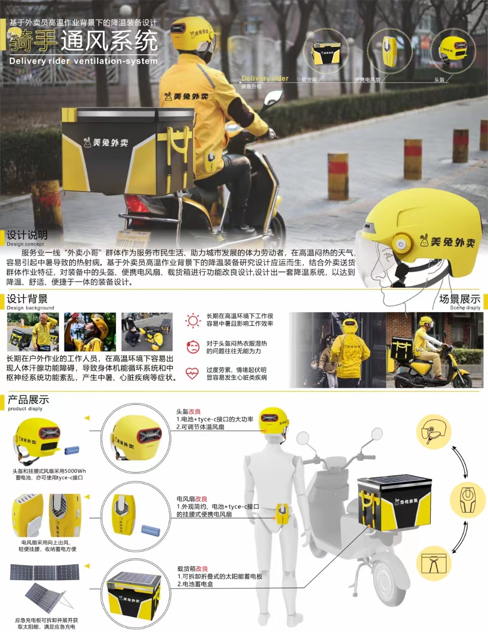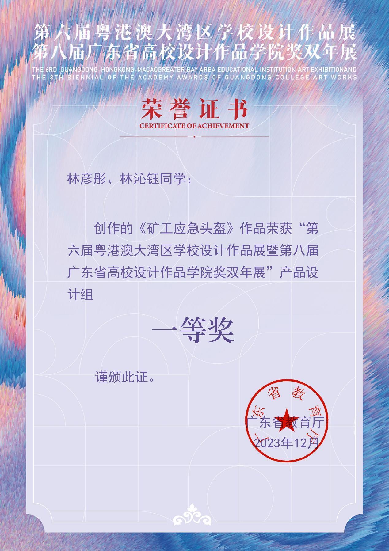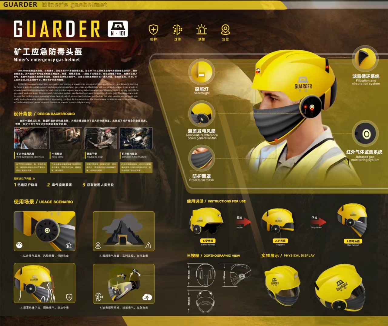 公司21级产品设计班林彦彤、21级工业设计2班林沁钰两位同学共同创作的《矿工应急头盔》作品,荣获“产品设计组”一等奖;21级工业设计1班吴俊、21产品设计班梁烨合作完成的《骑手通风系统》作品,荣获“产品设计组”三等奖。