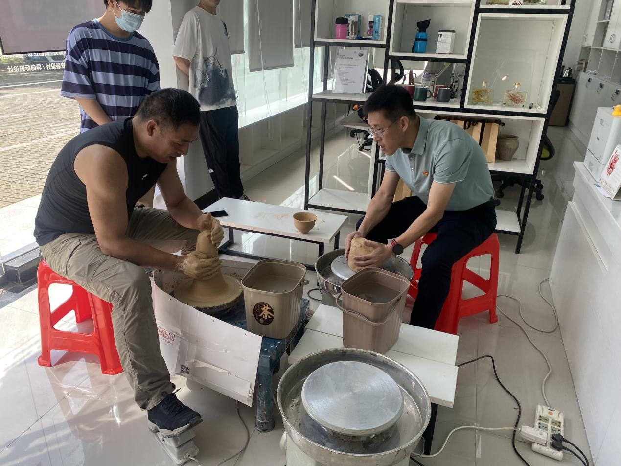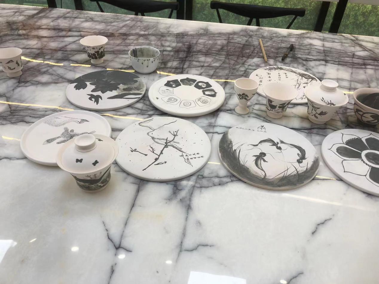 活动开始由陶艺专家专家对釉料属性、运笔方式、画面构图等进行示范讲解,对器皿拉坯与青花瓷盘面绘制进行现场教学,师生们全神贯注、认真听讲。师生们以庆祝建党101周年、喜迎二十大为主题,各自创作青花瓷绘制作品。