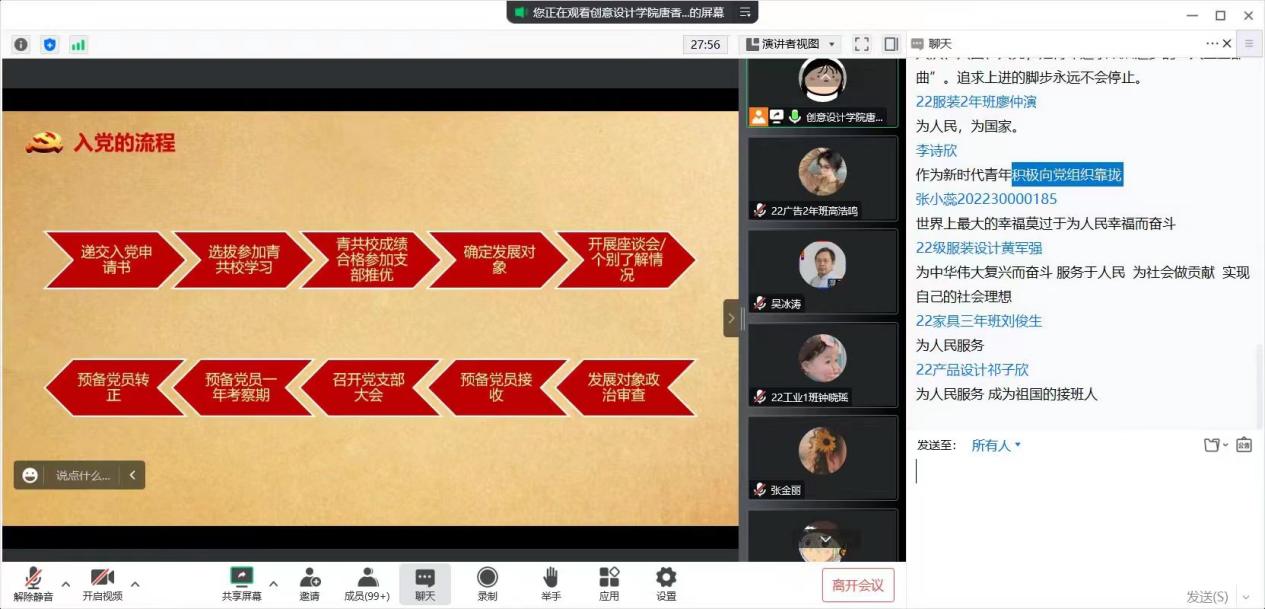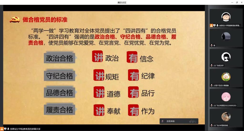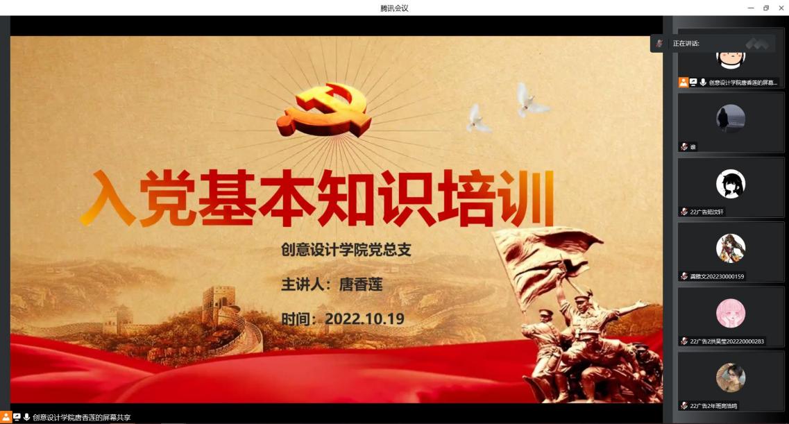 为了使当代老员工加深对党的认识,了解入党程序和党员应具备的条件,掌握党的基本知识,明确党员标准和肩负的历史使命,牢记党的宗旨,引导他们积极向党组织靠拢,10月19日晚19点,太阳成集团tyc122ccvip党总支采用线上会议的形式开展了“入党基本知识”专题培训,22级109名新生参加了此次学习。本次培训由太阳成集团tyc122ccvip党总支组织委员唐香莲同志主讲。