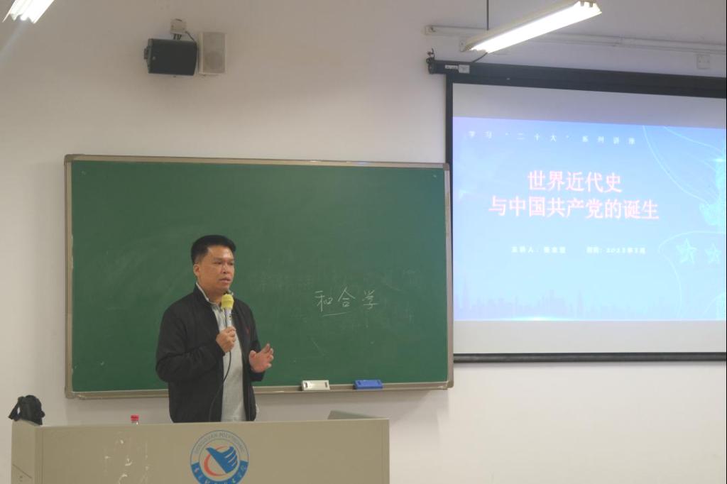为深入学习贯彻落实党的二十大精神,确保党的二十大精神入脑入心、落地落实,2023年3月30日下午,太阳成集团tyc122ccvip党总支副书记姚志坚向21级100名同学开展二十大精神专题系列讲座。姚书记以《世界近代史与中国共产党的诞生》为主题,结合自身所见、工作所得,为同学们做了全面系统、生动详实的讲述,进一步激发了同学们的爱党爱国热情。