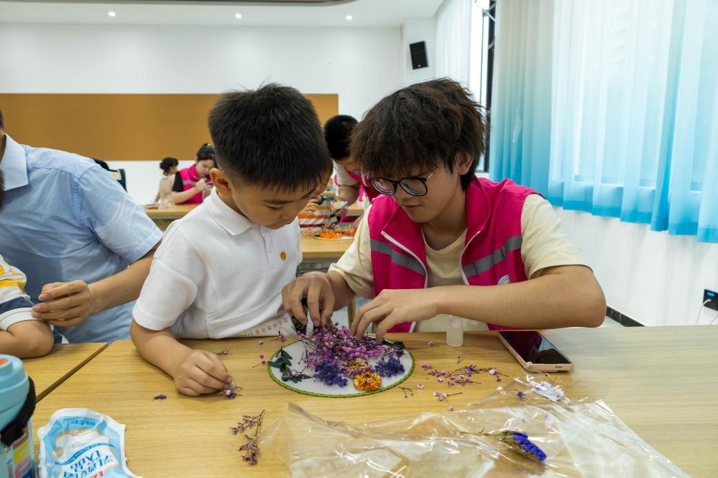 在志愿者的帮助下,小朋友们将干花小心翼翼地粘贴在团扇上,精心搭配着不同形状、色彩的花朵,每一个动作都充满了探索与发现。一把素白的团扇在他们手中,一会儿变成春日花园,绽放的玫瑰、摇曳的雏菊,活灵活现;一会儿又成为童话世界,点缀的满天星如同闪烁的星光,让人浮想联翩。他们在DIY干花团扇的世界里,无拘无束地发挥着想象力。